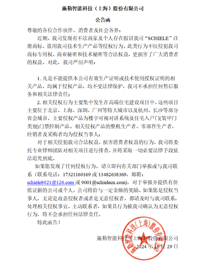 施勒智能科技(上海)股份有限公司 公告函 尊敬的各位合作伙伴、消费者及社会各...